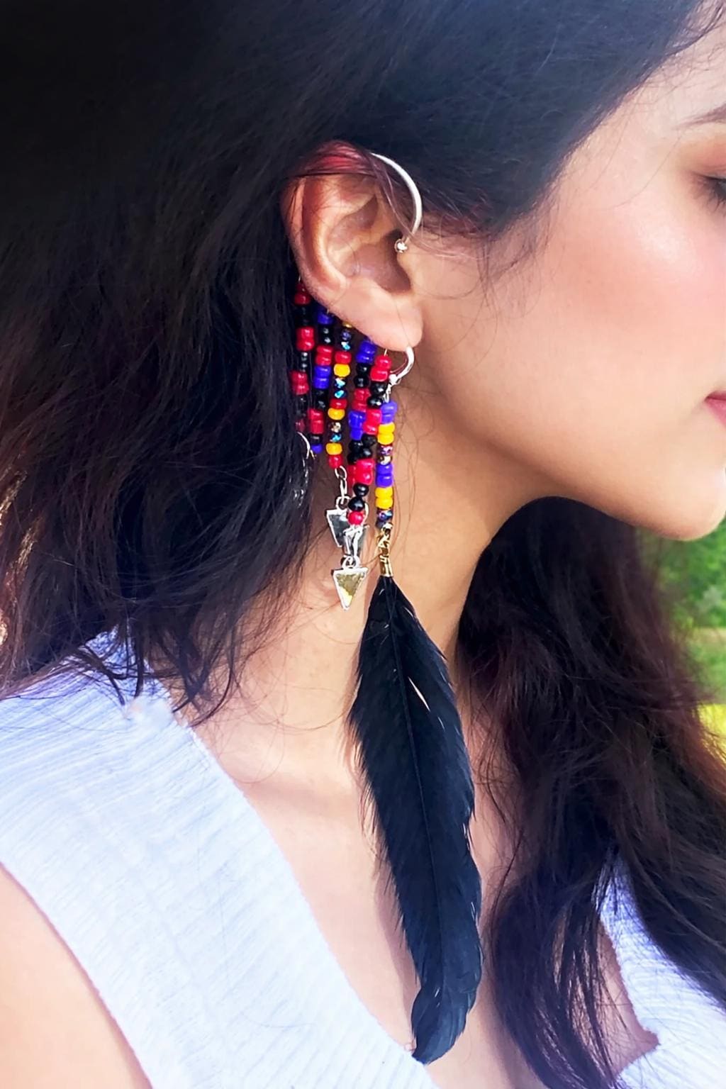 Black Feather Ear Cuff: Silver Ear Jacket, Beaded Boho Earring